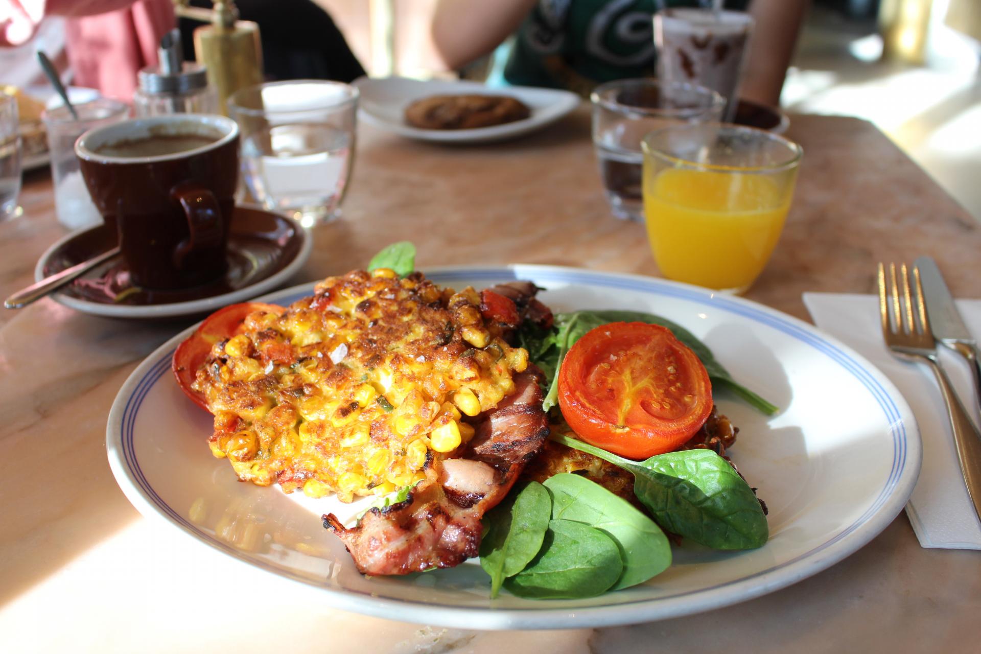 J'avais opté pour the fresh aussie - jasmine tea hot smoked salmon, poached eggs, greens, furikake, avocado and cherry tomatoes alors que Chéri a opté pour the sweet corn fritters, roast tomato, spinach and bacon !