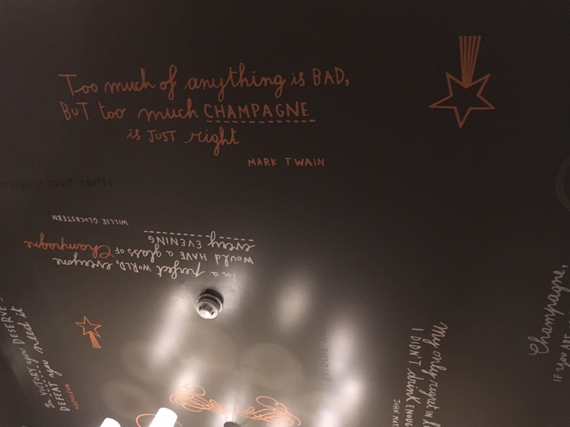 Confortablement installées dans le salon, nous pouvions admirer le plafond dédié au champagne et ses citations.