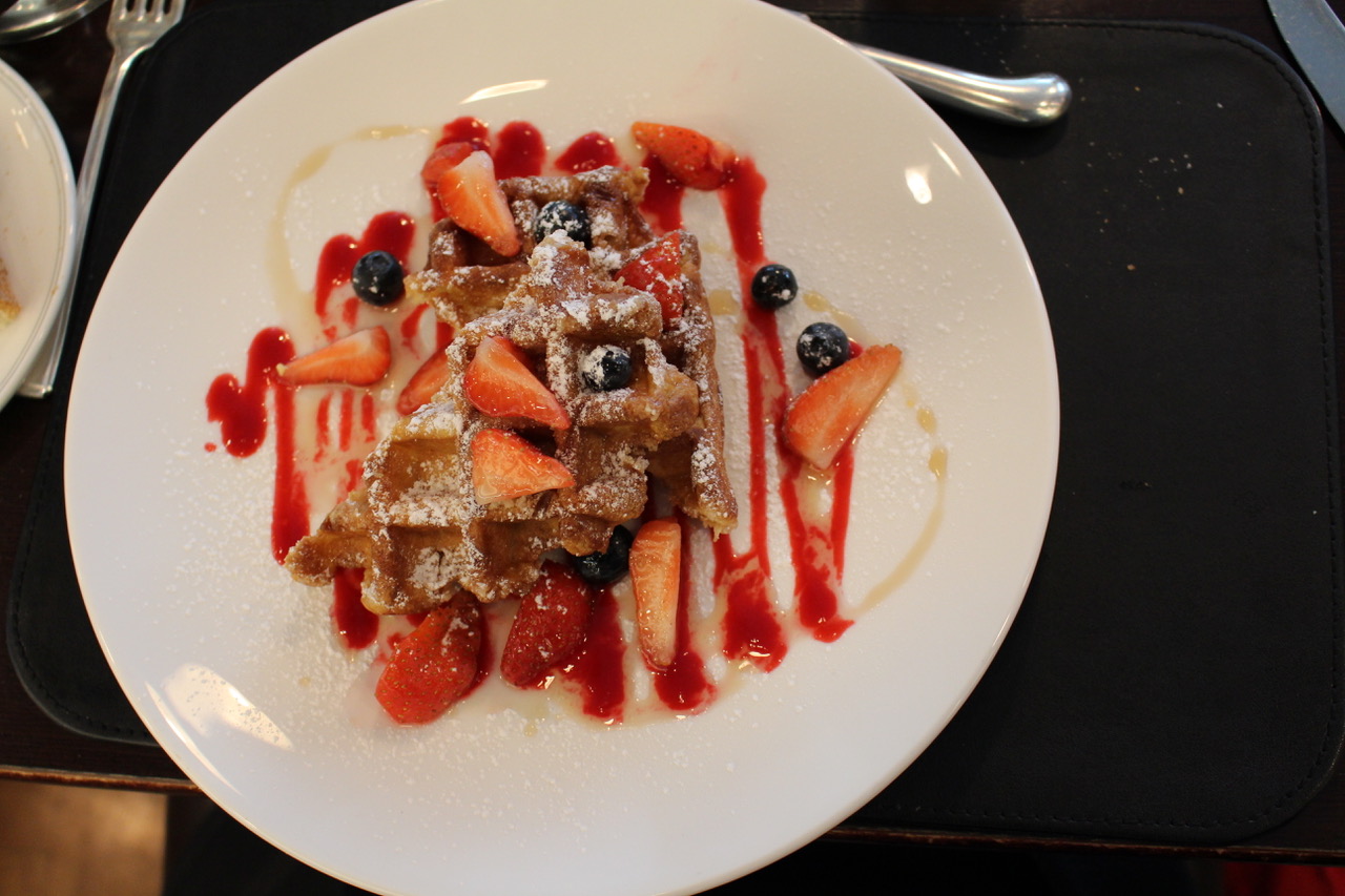 J'avais envie de prendre autre chose que l' English Breakfast classique, j'ai donc opté pour du saumon fumé et des oeufs brouillés (fumé sur place) , accompagnés de toasts grillés juste comme il faut! Tandis qu'Elijah la gourmande optait pour les gaufres au sirop d'érable et fruits rouges! Le tout arrosé de café et de chocolat chaud!
