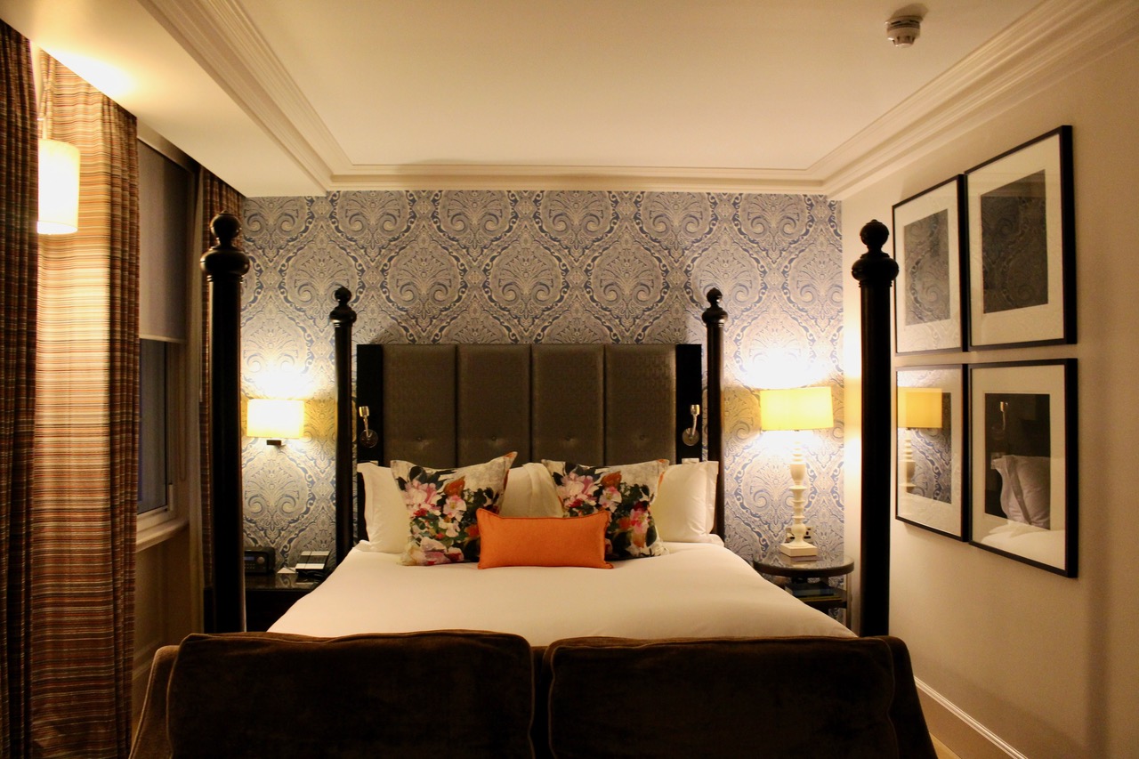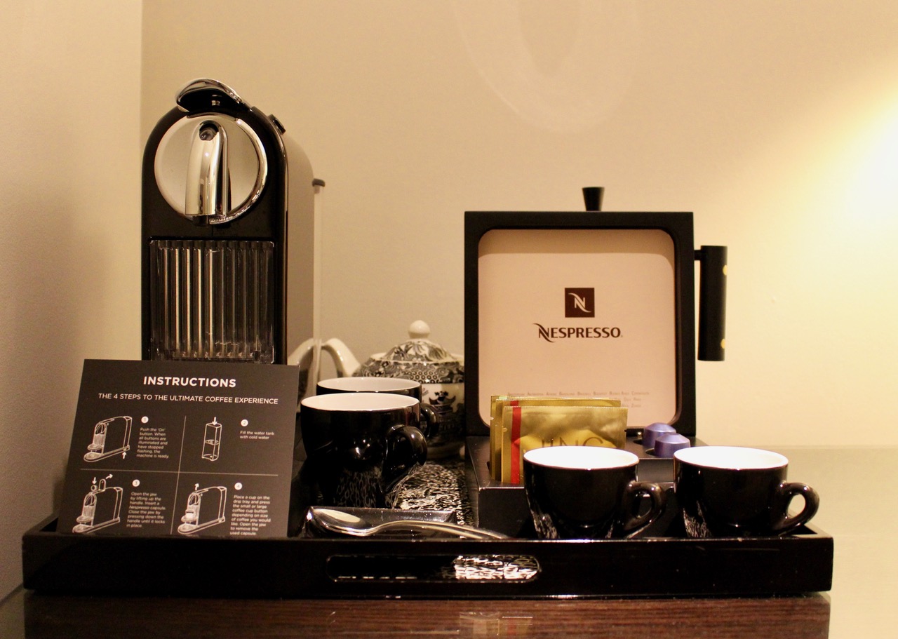 Le thé et le café sont mis à disposition sur une commode, avec une théière, du thé Jing™, des capsules de café Nespresso (What Else ?) et des boissons gratuites sans alcool dans le mini-bar. Il y a également un grand bureau juste à côté de la fenêtre avec une superbe lampe Paul Smith. La vue donne sur la rue calme et résidentielle, nous sommes loin d’imaginer à quelques mètres de là l’effervescence de l’hyper-centre de Londres.