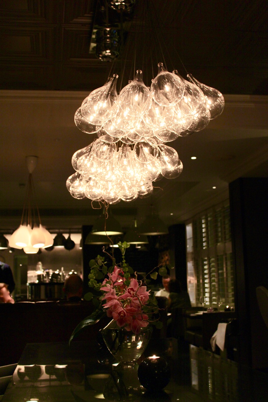 Le bar et restaurant de l’hôtel sont vibrants d’énergie avec leurs luminaires en bouquets éclatants d’ampoules...